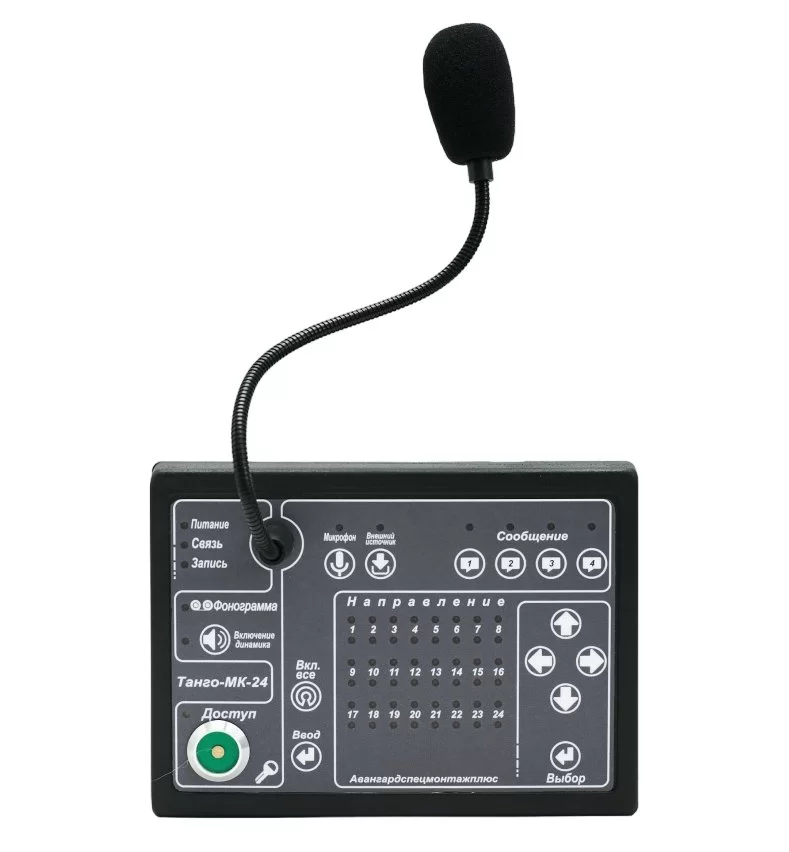 Микрофонная консоль «Танго-МК24» предназначена для передачи сигналов от микрофона и других внешних источников на устройства оповещения. Подключается к пульту управления «Танго-ПУ/БП-24», имеет встроенный микрофонный усилитель и кнопки выбора зоны трансляции, индикацию включенных выходов, содержит схему с 4-мя дополнительными фонограммами и соответственно кнопки выбора этих фонограмм. С консоли «Танго-МК24» можно осуществить трансляцию сигналов от микрофона и внешнего источника звуковых программ на любой выход любого зонального коммутатора, включить дополнительную фонограмму, записанную в микросхему памяти микрофонной консоли. «Танго-МК24» обеспечивает: – Усиление сигналов микрофона и их передачу на прибор управления; – Прием, усиление и передачу на прибор управления сигналов внешних источников звуковых программ; – Запись хранение и воспроизведение 4-х дополнительных фонограмм; – Индикацию включенных выходов управления зональных коммутаторов.