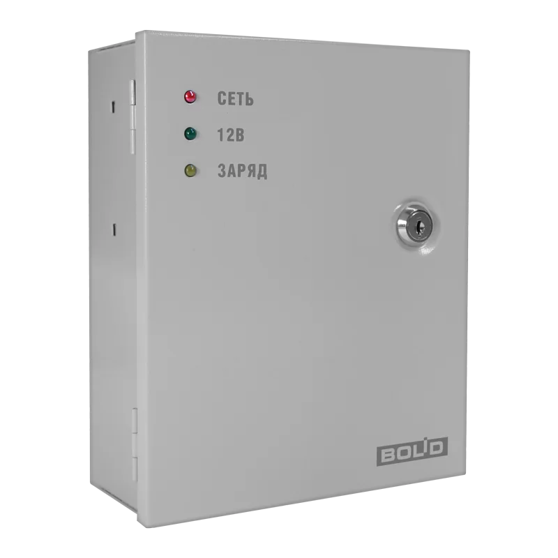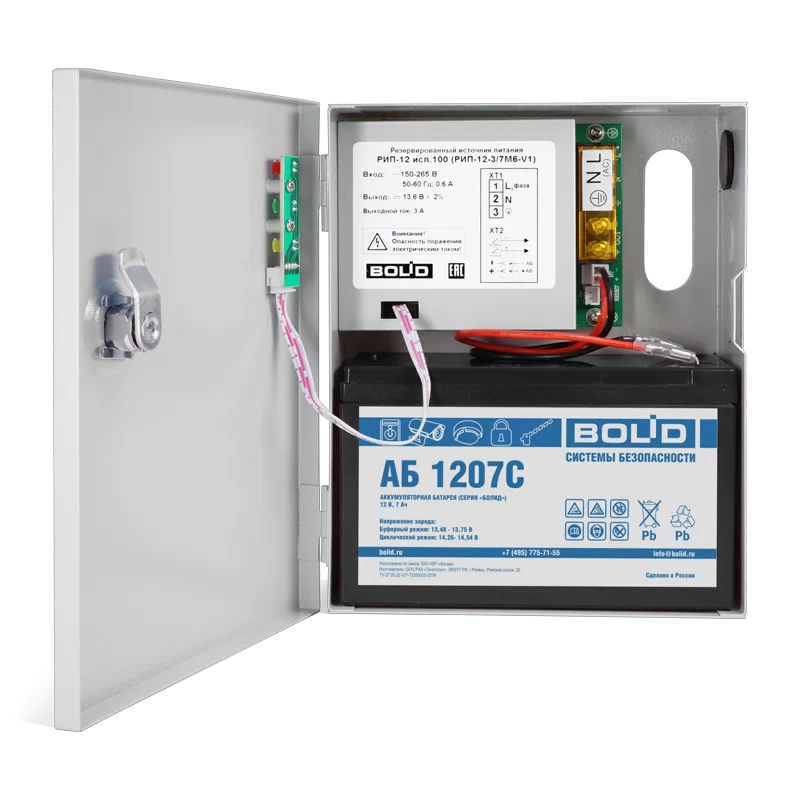 Резервированный источник питания РИП-12 исп.100 (РИП-12-3/7М6-V1) предназначен для питания видеокамер, систем контроля и управления доступом и других устройств с номинальным напряжением питания 12В. 12В, 3А; рекомендуемая емкость АБ 7Ач; световая индикация; защита от КЗ, защита от глубокого разряда, защита от перегрузки по выходу. Защита от короткого замыкания или перегрузки по току. Рекомендуемый резервный источник питания Аккумуляторные батареи серии “Болид”. Автоматическое отключение АБ от нагрузки при ее глубоком разряде Световая индикация состояний. Тип монтажа – настенный, навесной.