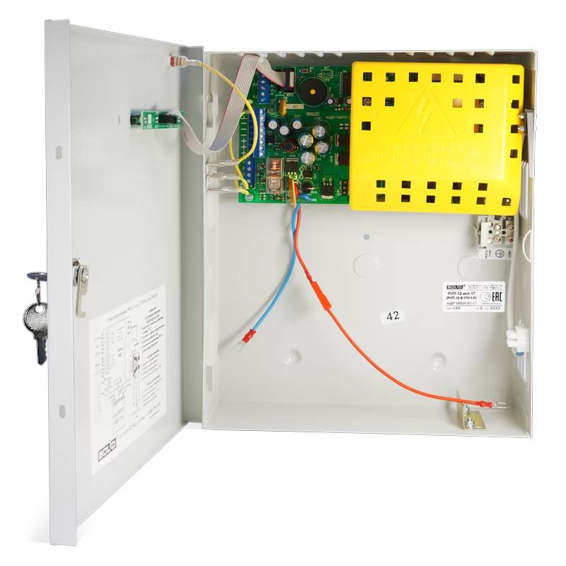 РИП-12 исп.17 (РИП-12-8/17М1-Р) предназначен для питания технических средств пожарной автоматики и других слаботочных систем. 12В; 8А (мах 10А); емкость АБ 17Ач (возможность подключения внешних АБ 34Ач); световая индикация; звуковая сигнализация; датчик вскрытия корпуса; защита: от перенапряжения, от КЗ, от переполюсовки АБ.